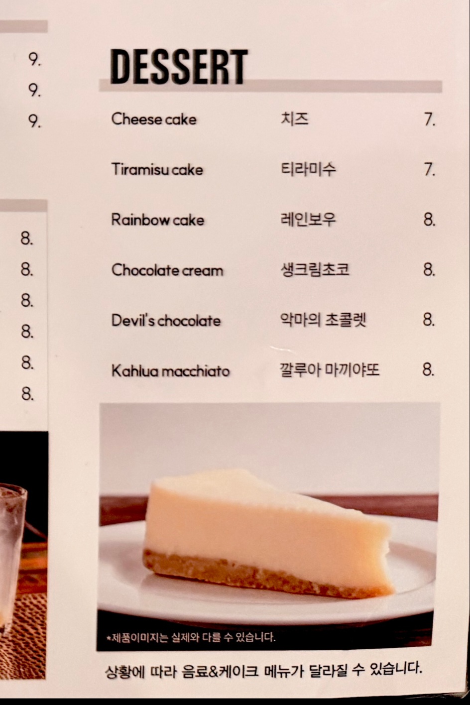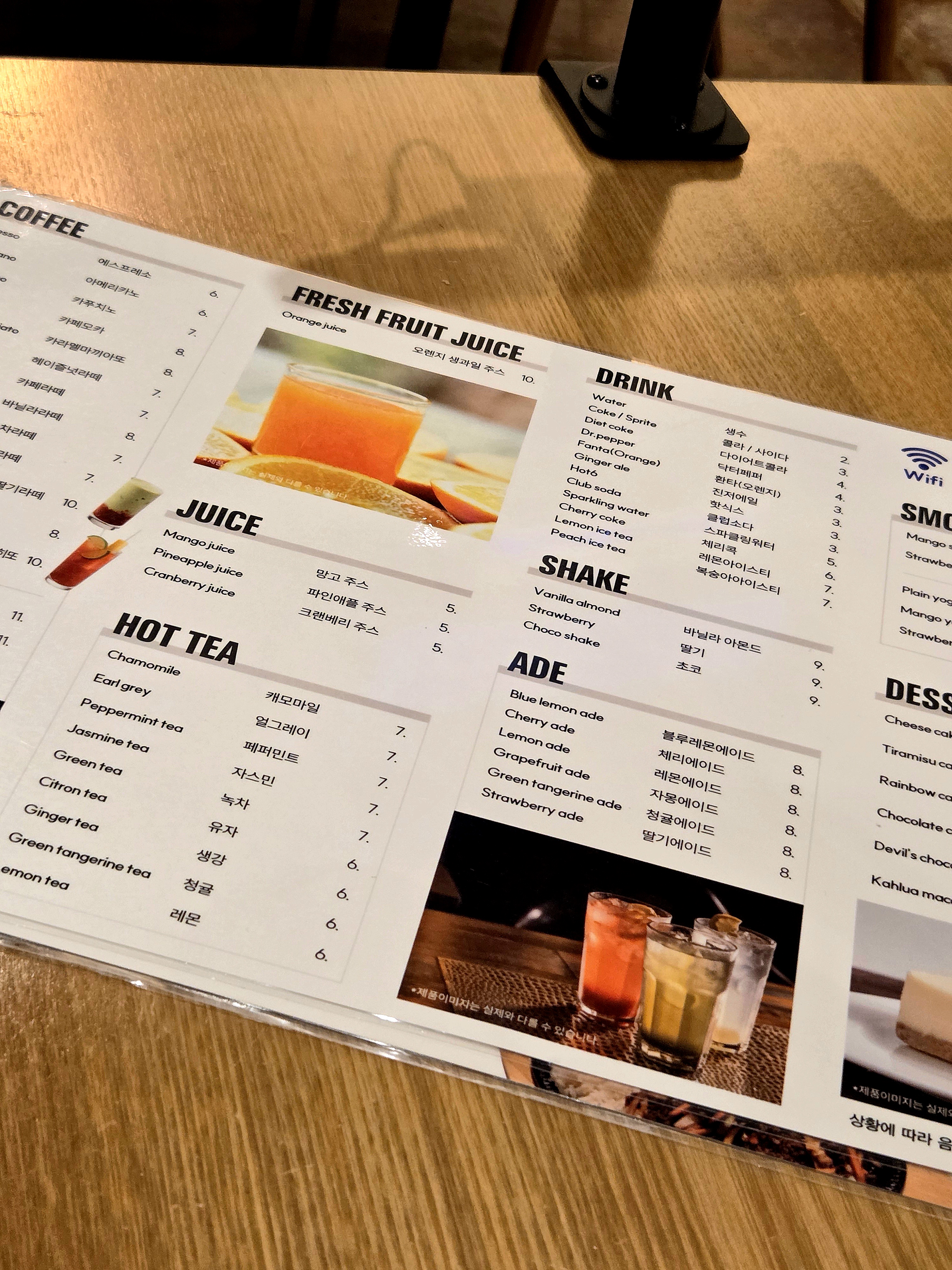 메뉴판엔 음식부터해서 커피, 술, 디저트 등등